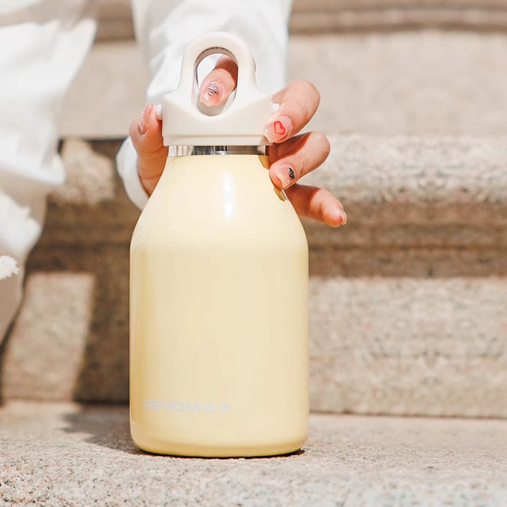 Revomax er den bæredygtige termoflaske i rustfrit stål, der åbnes og lukkes med én hånd og ét klik – helt uden styrke.